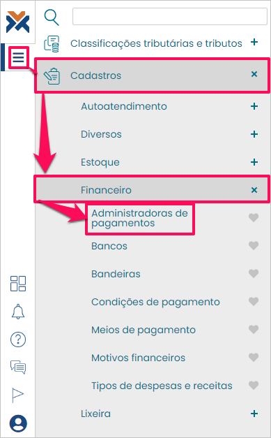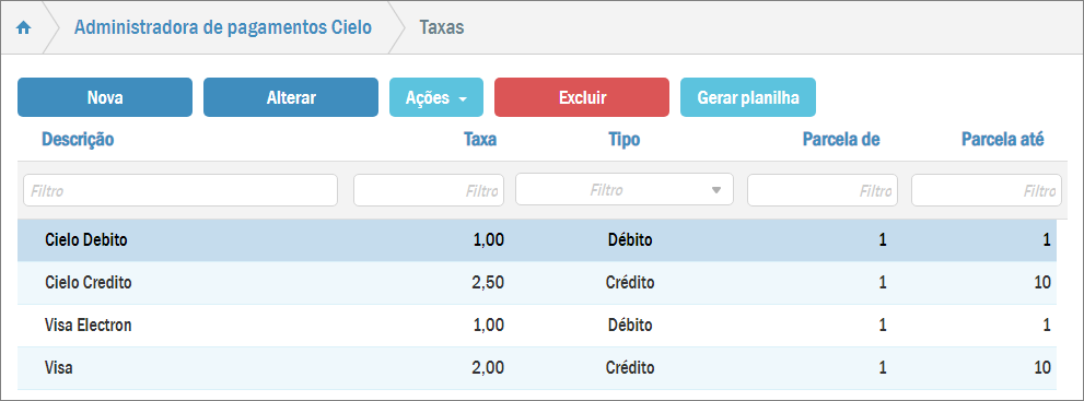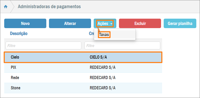 Para isso acesse: Menu > Cadastros > Financeiro > Administradoras de pagamentos.
