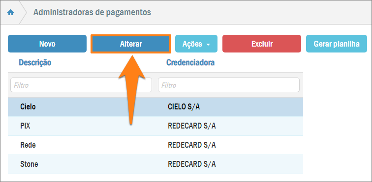 Desta forma, você abrirá a lista de administradoras de pagamentos já cadastradas no sistema. Selecione aquela que você necessita modificar. Serão habilitados alguns botões, entre eles o botão Alterar.