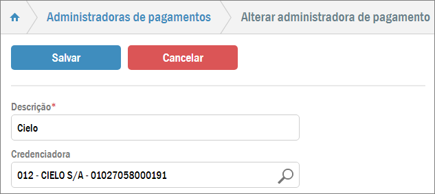 Pressione o botão. Será aberta a tela de alteração. Modifique o que for necessário no campo Descrição e/ou no campo Credenciadora.