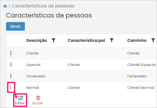 Desta forma será aberta a listagem de características de pessoas. Para modificar algum destes cadastros você deve clicar nos três pontinhos ao lado do registro desejado e depois pressionar o botão Editar.