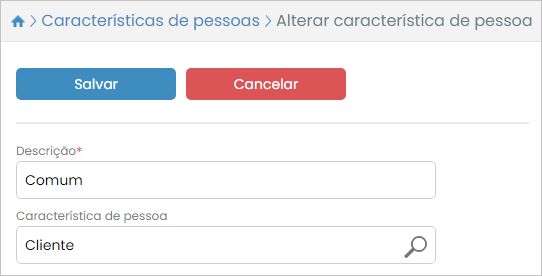 Desta forma será aberta a tela de alteração. Será possível modificar a descrição da característica selecionada ou até mesmo a sua característica pai, através do campo Característica de pessoa.