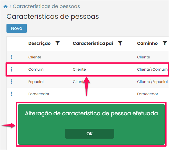 Terminando a alteração pressione o botão Salvar. A modificação poderá ser vista imediatamente na listagem de caraterísticas e o sistema exibirá uma mensagem de sucesso na operação.