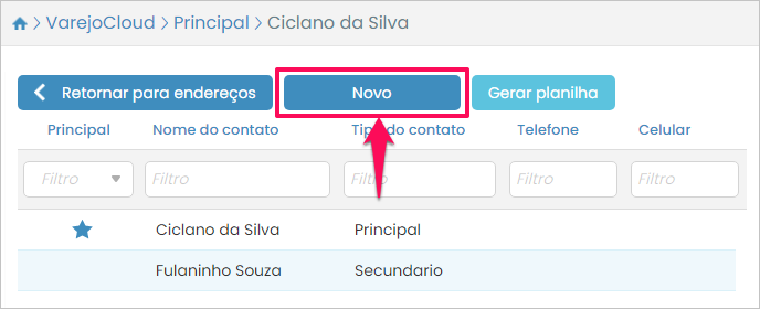 Por fim, se você precisar adicionar um outro contato para o endereço, ainda na listagem de contatos, pressione o botão Novo.