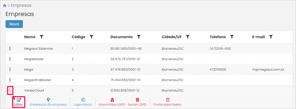 Desta forma serão exibidas as empresas já cadastradas no sistema. Para realizar ajustes em algum registro aperte os três pontinhos ao lado do nome da empresa e depois pressione o botão Editar.