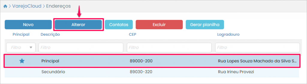 Para modificar um endereço já cadastrado selecione-o e pressione o botão Alterar.