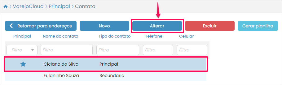 Para modificar os dados de um contato selecione-o e pressione o botão Alterar.