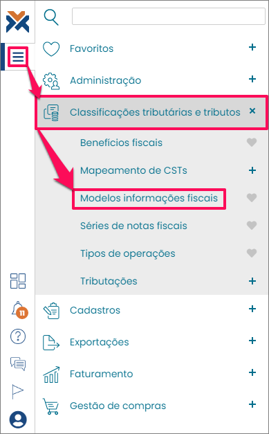 Para ter acesso a esta funcionalidade, no Menu, clique em: Classificações tributárias e tributos > Modelos informações fiscais.
