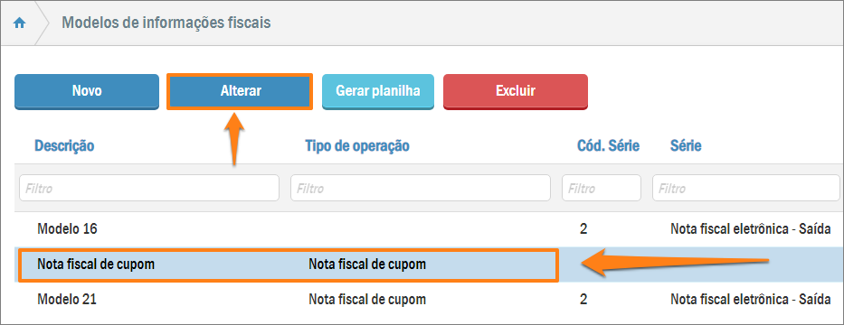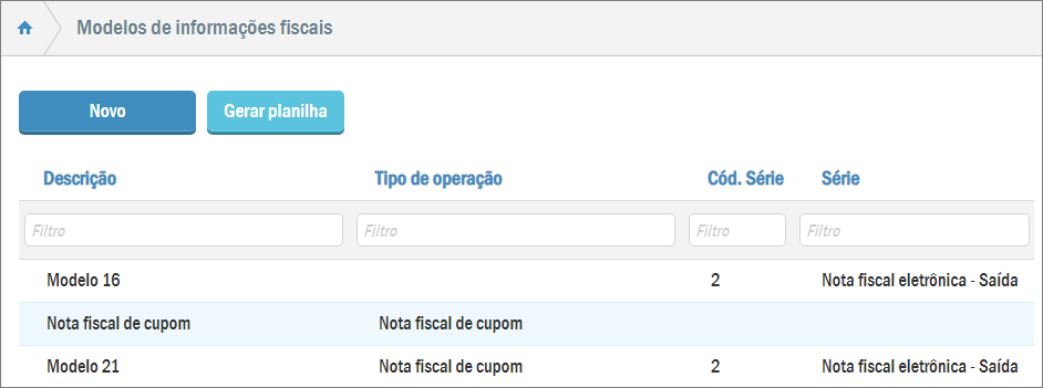 Desta forma você verá a listagem de modelos fiscais cadastrados no sistema: