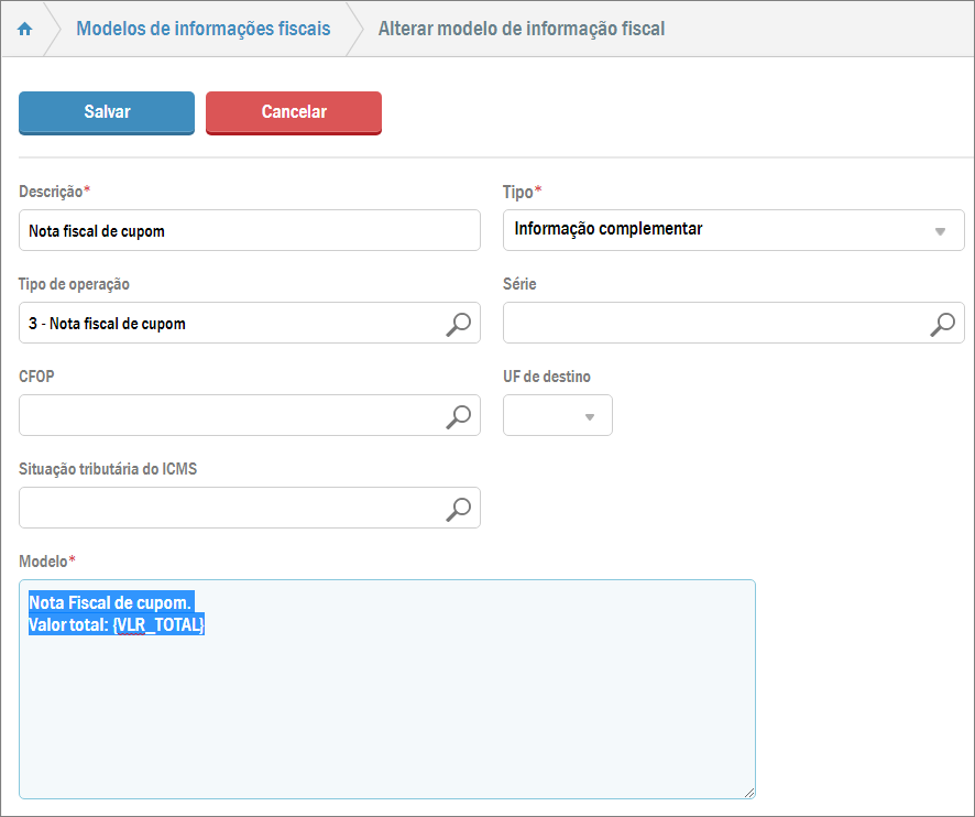 O VarejoCloud possibilita a configuração do sistema para que toda vez que for emitida uma nota fiscal eletrônica (por exemplo) seja exibida uma determinada observação. Se necessário, também é permitido alterar este modelo de informação fiscal.