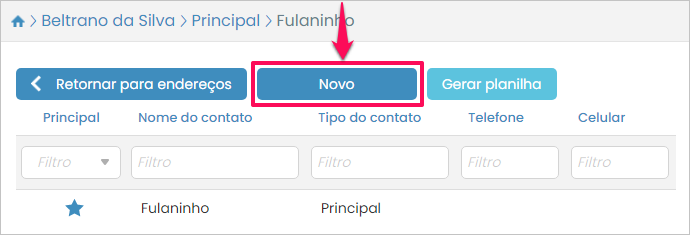 Por fim, se você precisar adicionar um outro contato para o endereço, ainda na listagem de contatos, pressione o botão Novo.