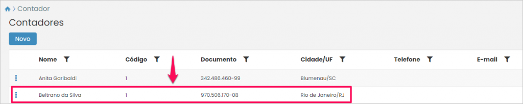 Desta forma você chegará à listagem de contadores cadastrados no sistema. Caso você necessite alterar/adicionar algum dado referente à identificação do contador, seus documentos ou informações adicionais, basta clicar sobre ele.