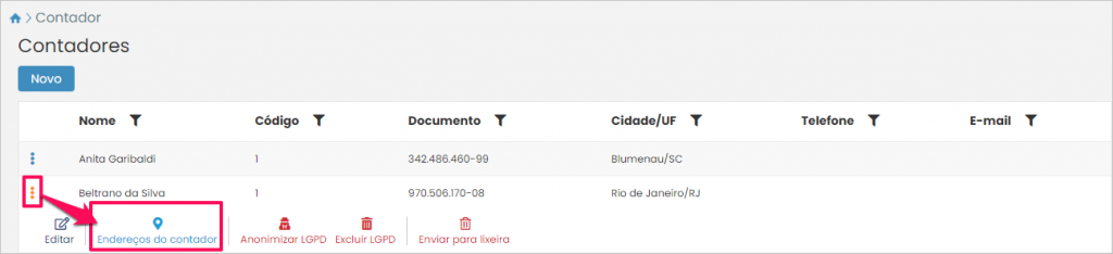 Agora, caso você queira alterar dados de um dos endereços do contador, ou adicionar um endereço, na listagem, clique nos três pontinhos ao lado do nome do contador e depois pressione o botão Endereços do contador.
