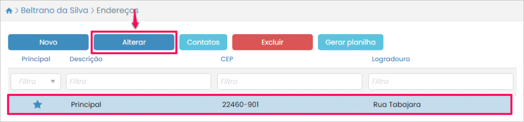 Para modificar um endereço já cadastrado selecione-o e pressione o botão Alterar.