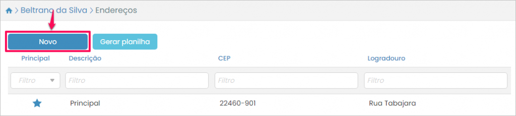 Caso você queira adicionar outro endereço, na listagem de endereços, pressione o botão Novo.