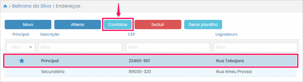 Agora, caso você queira alterar os dados de algum contato de um endereço do contador, ou adicionar um novo contato, ainda na listagem de endereços selecione o desejado e pressione o botão Contatos.