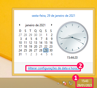 Primeiramente, clique com o mouse sobre a hora e a data, na parte inferior direita da tela. Depois clique sobre a opção Alterar configurações de data e hora…