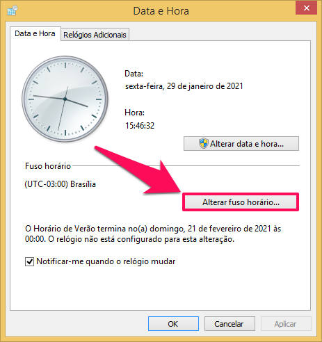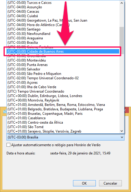 Então, clique sobre a seta do lado da cidade cujo fuso horário está sendo utilizado.