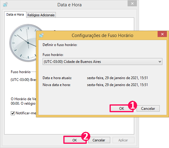 Depois de selecionar a cidade basta clicar em OK na tela de configurações e novamente em OK na tela de data e hora.