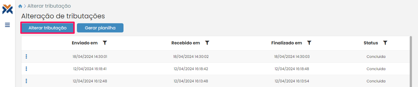 Você será direcionado para página de histórico das alterações. Clique no botão Alterar tributação.