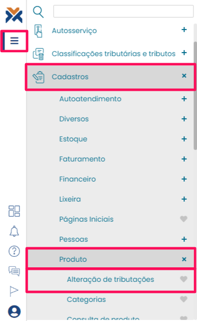 Entre no VarejoCloud e clique no botão para abrir o menu. Acesse Cadastros > Produto > Alteração de Tributações.