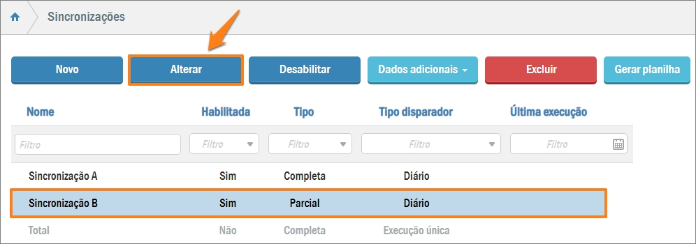 Será exibida a tela contendo todas as sincronizações já cadastradas. Para alterar uma delas, selecione o registro e clique em Alterar: