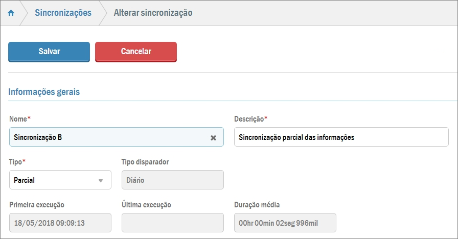 Aqui o Tipo disparador, por exemplo, não pode ser ajustado. Os demais (exceto os campos de execução e duração média da execução, automaticamente preenchidos pelo sistema ao realizar a sincronização) podem ser alterados.