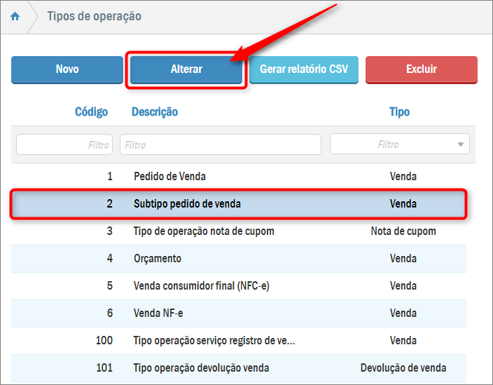 Na tela seguinte será exibida a listagem de todos os tipos de operações já existentes no sistema. Para alterar uma delas, seja ela qual for, basta clicar no registro desejado e clicar em Alterar: