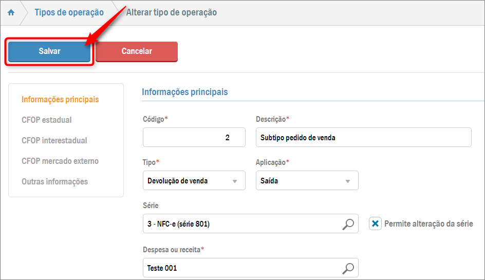 Depois o sistema apresenta a tela para alteração dos dados do tipo de operação selecionado. Faça as modificações desejadas e, por fim, clique em Salvar para efetivá-las.