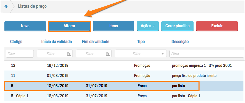 Será exibida a tela contendo todas as listas já cadastradas. Para alterar uma delas, selecione o registro e clique em Alterar: