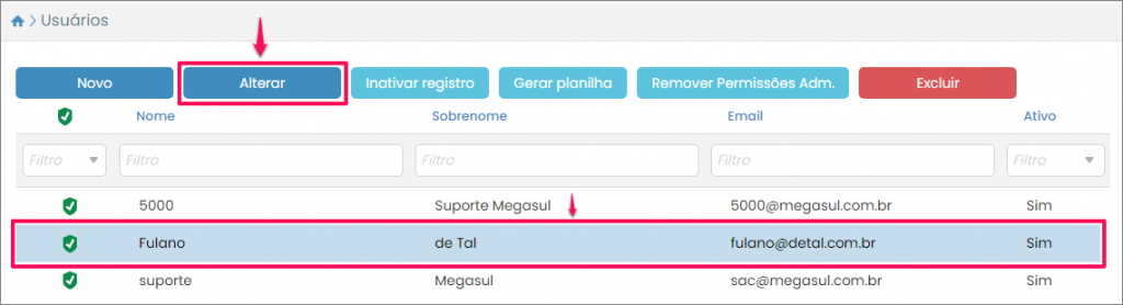 Em seguida, será exibida a listagem de usuários já cadastrados no sistema. Para realizar alguma modificação selecione o usuário desejado e pressione o botão Alterar: