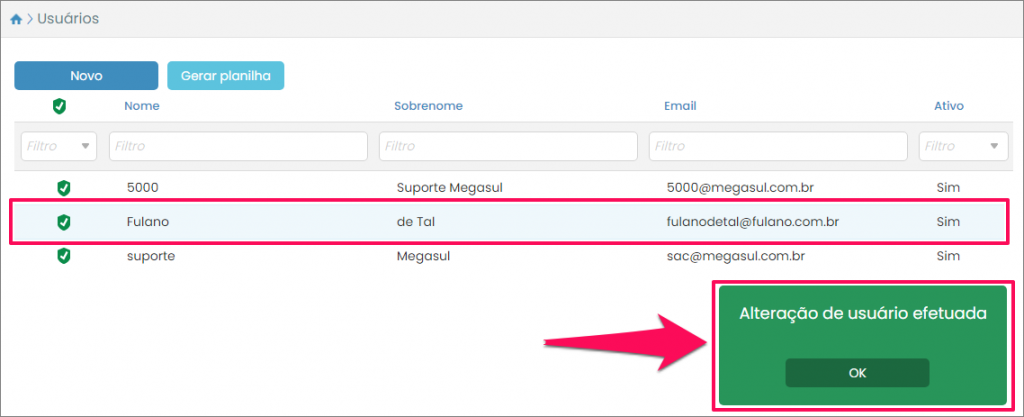 Depois de realizadas as alterações não esqueça de clicar em Salvar para efetivá-las. Veja que na sequência é exibida uma mensagem confirmando o sucesso da operação e o registro é atualizado: