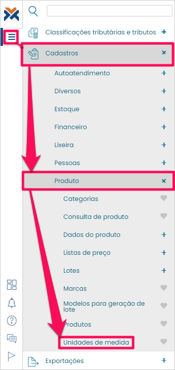 Para inativar um cadastro de unidade de medida acesse: Menu > Cadastros > Produto > Unidades de medida.