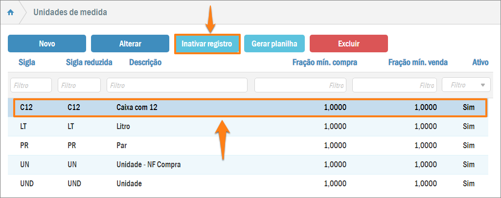 Clique sobre a unidade de medida que deseja desativar e pressione o botão Inativar registro. Assim, o seu registro ficará mais apagado, em cinza, e o sistema exibirá uma mensagem confirmando a desativação.