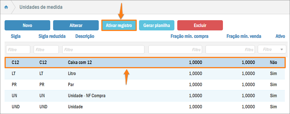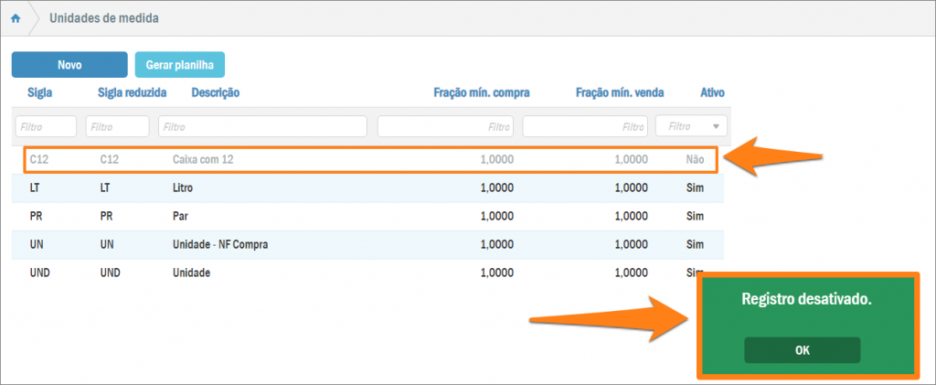 Desta forma, a unidade de medida ficará novamente à disposição para uso, o seu registro será pintado de preto e o sistema emitirá uma mensagem avisando sobre a ativação.