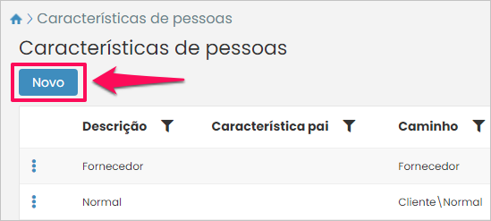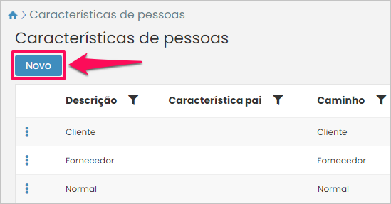 Para iniciar o cadastro acesse: Menu > Cadastros > Pessoas > Características.