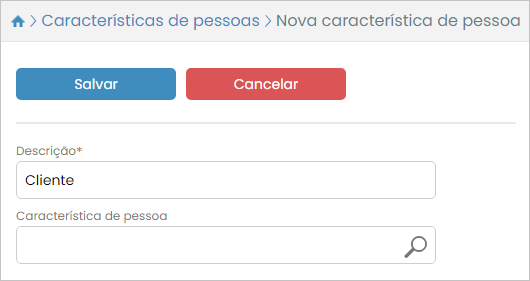 No nosso exemplo vamos criar a característica filho “Especial”, aplicada para clientes. Desta forma poderemos criar promoções que serão aproveitadas por um grupo específico de clientes. Para isso primeiramente vamos cadastrar a característica pai “Cliente”. Faremos isso adicionando este nome no campo Descrição, deixando o campo Característica de pessoa em branco e pressionando o botão Salvar.