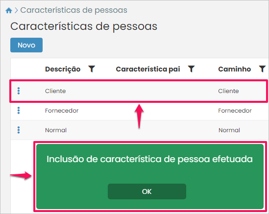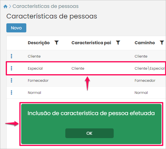 Assim, a nova característica pai será adicionada na listagem e o sistema emitirá uma mensagem de sucesso na operação.