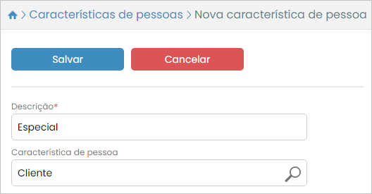 Agora, na tela de cadastro, vamos preencher o campo Descrição com o nome “Especial”. Já no campo Característica de pessoa iremos selecionar a opção “Cliente”. Por fim, basta pressionar o botão Salvar.