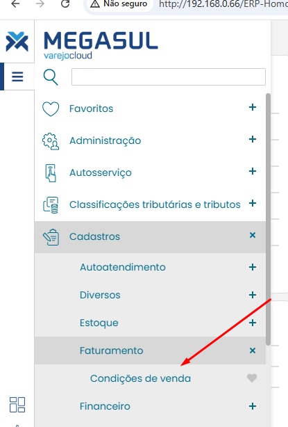 Clique no botão de menu (Ξ) à esquerda da tela inicial e siga o caminho Cadastros Faturamento Condições de venda.