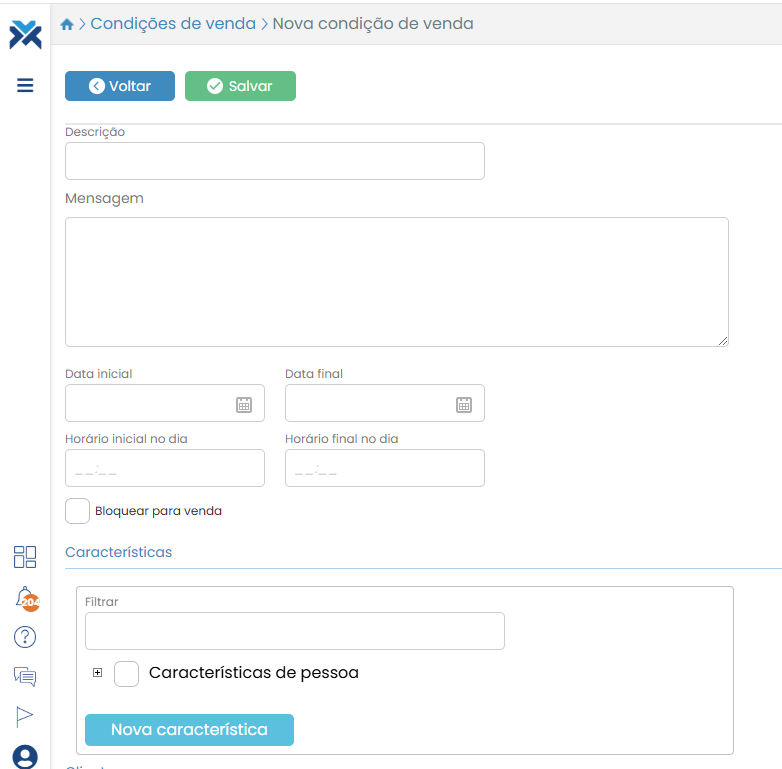 O campo Características ou Clientes, identifica as características ou clientes específicos que estarão vinculados na condição de venda.