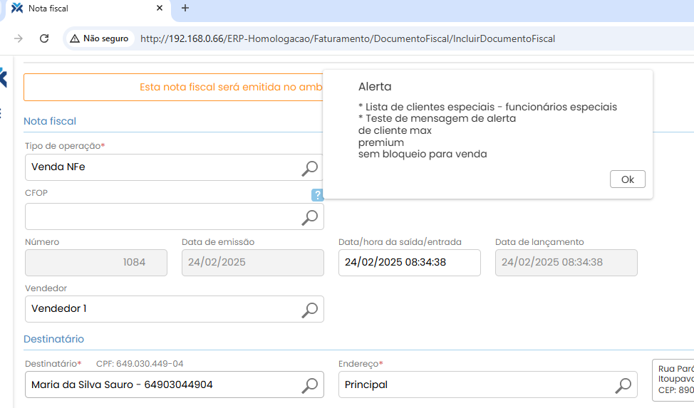 Nas telas de vendas: Notas fiscais, Pedidos de vendas, Vendas, VPDV / Caixa online. Poderá ver um alerta quando um cliente inserido estiver vinculado na condição de venda cadastrada.