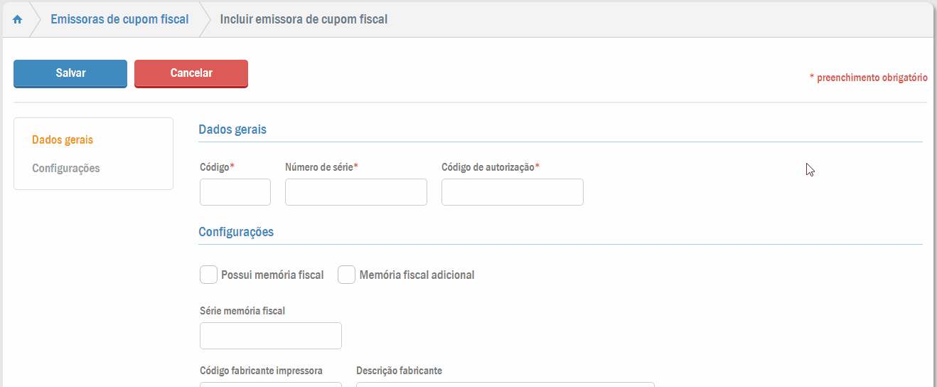 Será aberta a tela de cadastro para inserção dos dados do ECF: