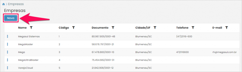 Para incluir um novo cadastro no sistema, clique em Nova: