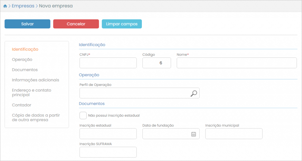 Preencha com o CNPJ e o Nome da empresa. Já o Código se refere a um código gerado automaticamente pelo sistema; ele pode ser revisto e ajustado, se necessário.