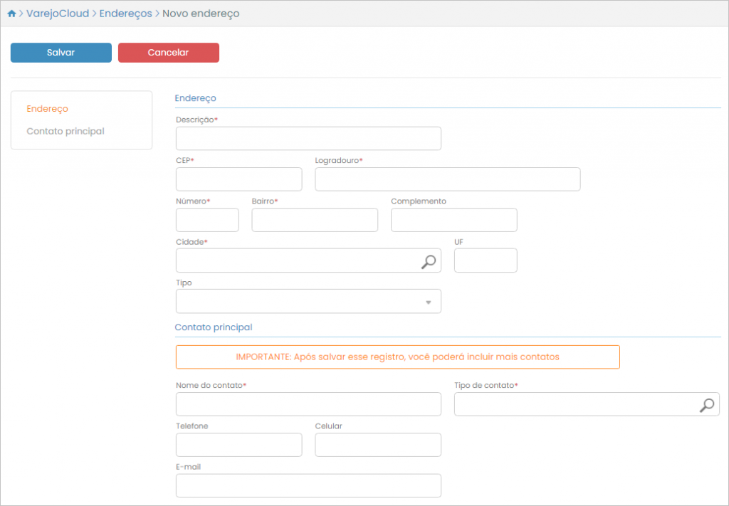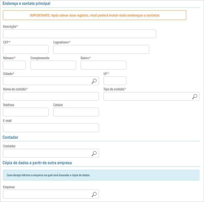Informe a Descrição deste endereço (algo que o identifique em relação aos demais), CEP, Logradouro, Número, Complemento, Bairro, Cidade, UF. Depois, defina o Nome do contato principal desta empresa, e classifique este Tipo de contato (esses tipos devem ser previamente cadastrados pelo usuário). Por fim, indique o Telefone, Celular e E-mail para contato.