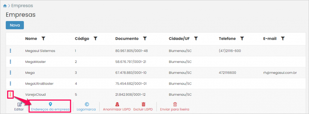 No cadastro inicial você só poderá inserir um endereço para a empresa. Caso você queira ainda adicionar mais endereço(s) clique nos três pontinhos ao lado do nome da empresa e depois pressione o botão Endereços da empresa.