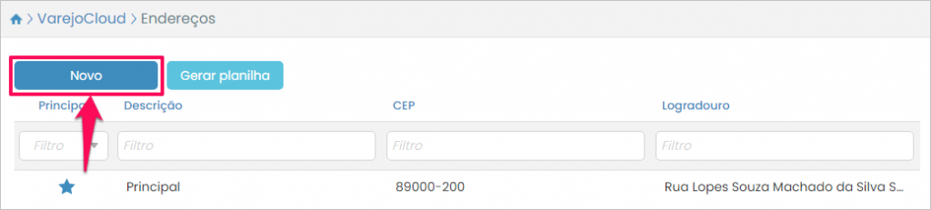 Você verá a listagem de endereços (inicialmente com apenas um). Para adicionar outro pressione o botão Novo.