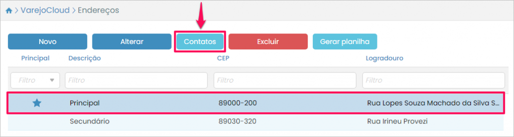 Agora, caso você queira adicionar mais contatos para algum dos endereços cadastrados para a empresa, na listagem de endereços, selecione o desejado e depois pressione o botão Contatos.