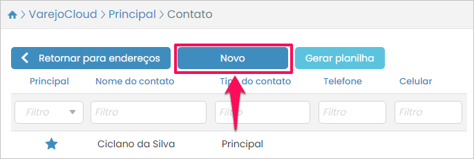 Será exibida a lista de contatos do endereço selecionado. Para adicionar outro pressione o botão Novo.
