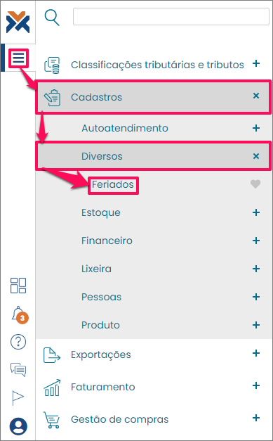 Para cadastrar um feriado, acesse o menu do VarejoCloud > Cadastros > Diversos > Feriados: